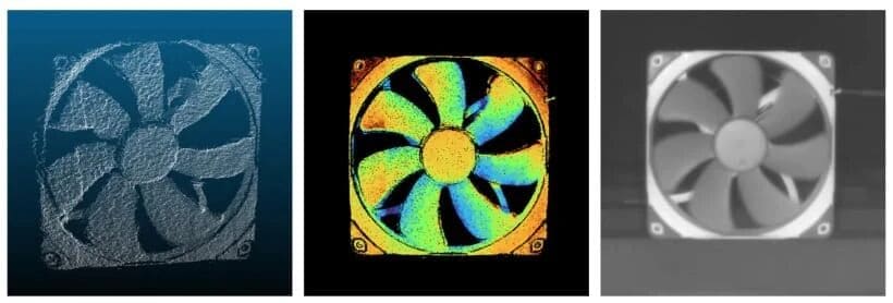 旋转的140毫米风扇轮的3D点云(左)、深度图像(中)和强度图像(右),拍摄距离为40厘米,转速为400转/分钟。