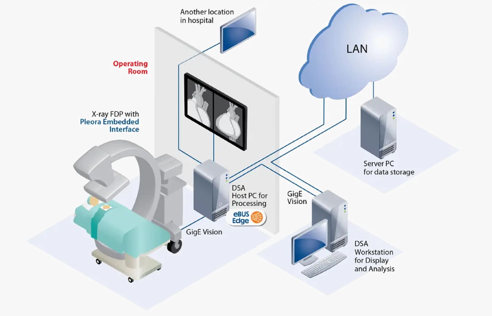 在主机 PC 上,eBUS Edge 通过 GigE Vision 链路同时将实时成像数据以及患者和系统元数据传输到 DSA 工作站,不会影响用于处理和分析的 CPU 性能。工作站接收图像供操作员显示,并将报告数据发送服务器。