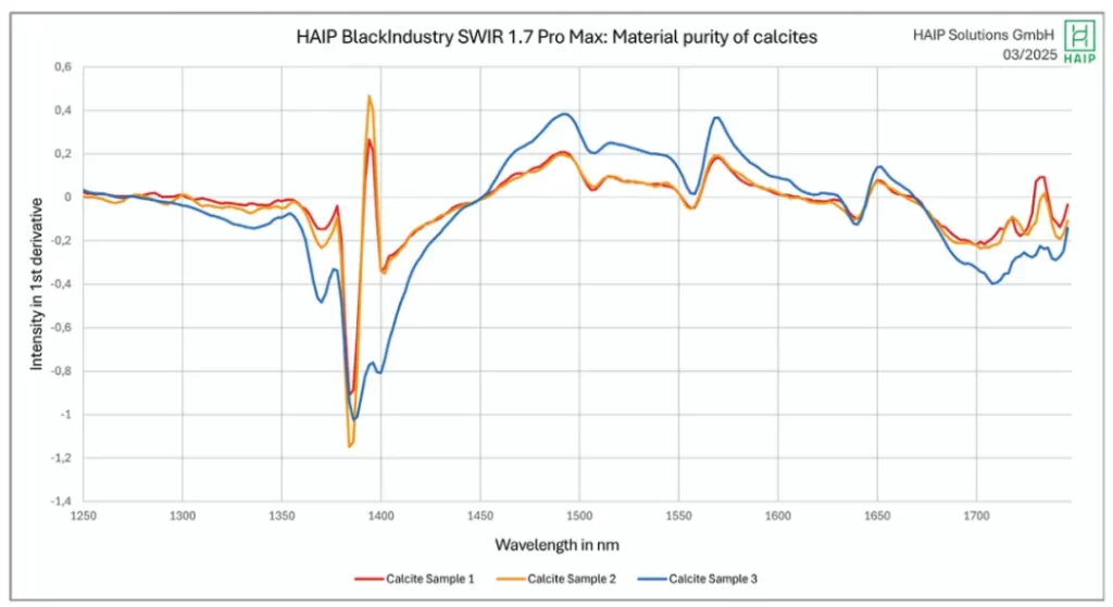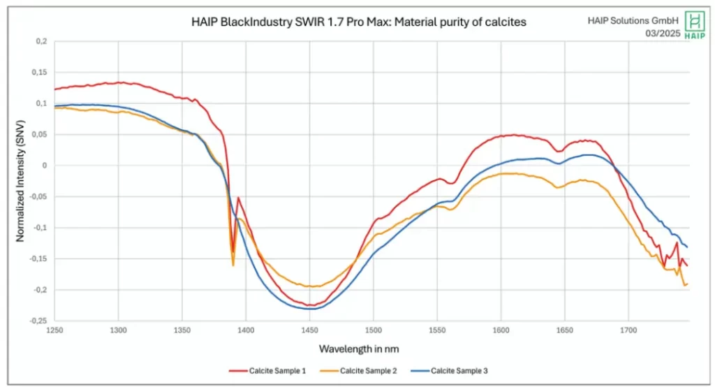 以下实验使用BlackIndustry SWIR 1.7 Pro Max 相机分析了方解石样品的材料纯度。为此,我们实现了一个 5 μm 的入口狭缝,可实现高达 0.96 nm/像素的像素采样。结合相机的极高空间分辨率,方解石样品的光谱细节现在可以用于光学分选应用,这在以前是现有高光谱相机无法实现的,范围高达 1700 nm。方解石的吸收带在 ~1510 nm 和 ~1640 nm 处清晰可见。