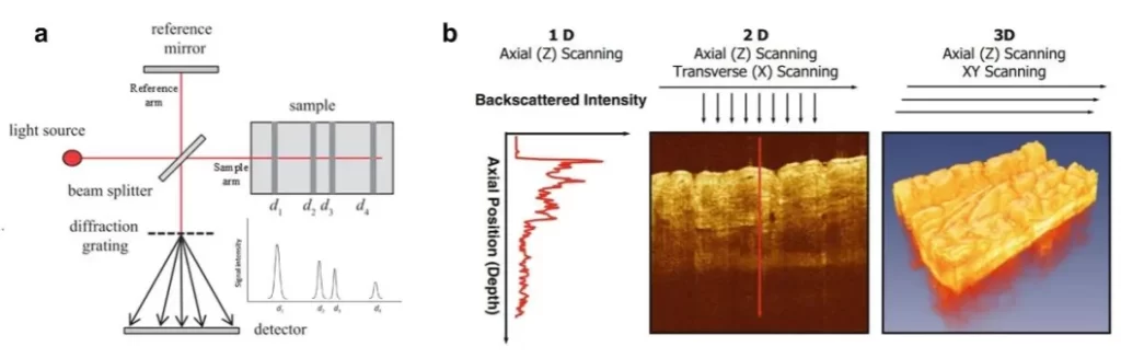沿深度方向的后反射或后向散射的测量扫描称为A扫描,沿横向移动进行多次A扫描则能生成截面图像(B扫描),多个B扫描叠加则可得到三维结构数据(C扫描),如下图4b所示。