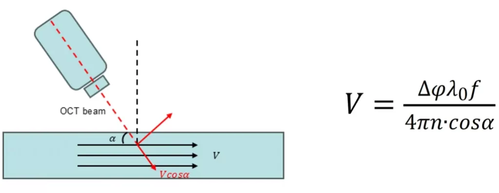 多普勒OCT是OCT的一种扩展应用,原理来源于多普勒效应。通俗来说,就像救护车的警笛声在靠近或远离时会改变音调,当光照射到运动的散射体(例如血液中的红细胞,或管道里的微粒)时,反射光的相位也会发生微小的变化。多普勒OCT正是利用这一特性,通过分析连续A扫描之间的相位差,就可以计算出颗粒沿光束方向的速度分量,如图5示意图和公式所示
