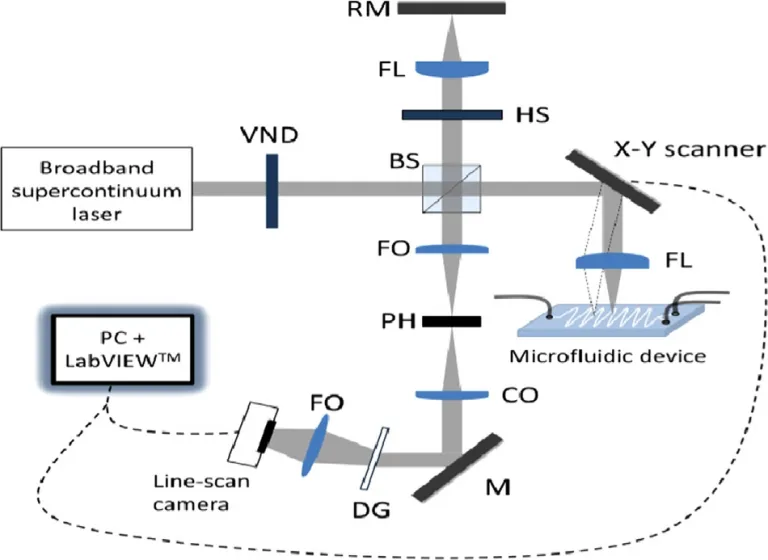 VND–可变中性密度滤光片,BS–分束器,HS–水平狭缝,FL–聚焦透镜,RM–参考镜,X-Y scanner–扫描振镜,FO–聚焦物镜,PH–针孔,CO–准直物镜,M–反射镜和DG–衍射光栅