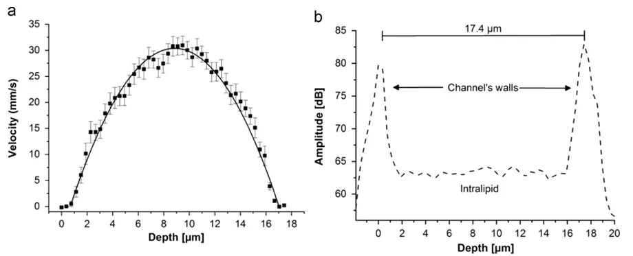 图3(a)来自微流体通道中心部分的流速分布和 (b)相应的OCT信号(图2a中的白线)