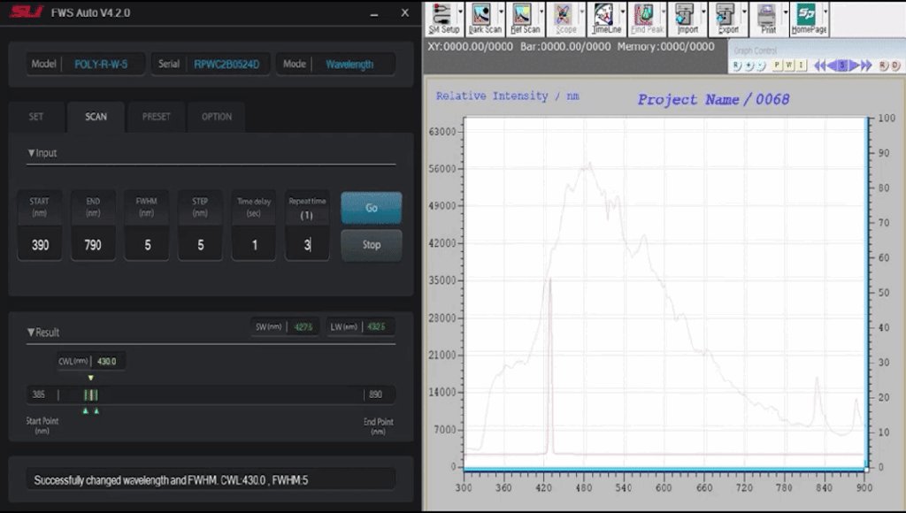 带宽设置:在390–790 nm范围内,设置FWHM为5 nm;