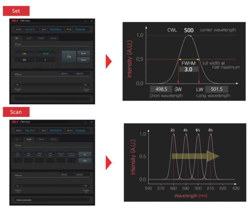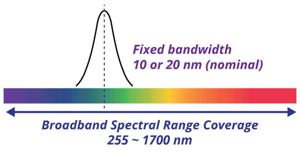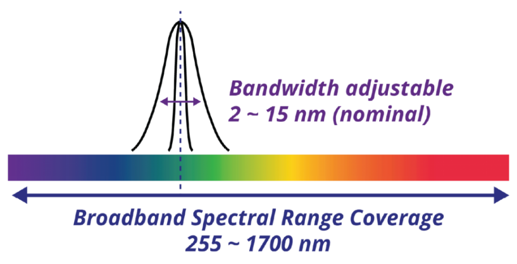 • 灵活的带宽调节:友思特波长选择器提供多种带宽设置选项,最小FWHM可达2 nm,最大FWHM可设置为15nm;也可以固定设置为10nm或20nm