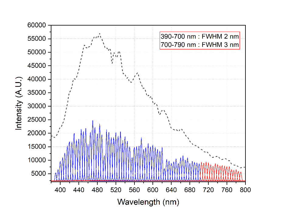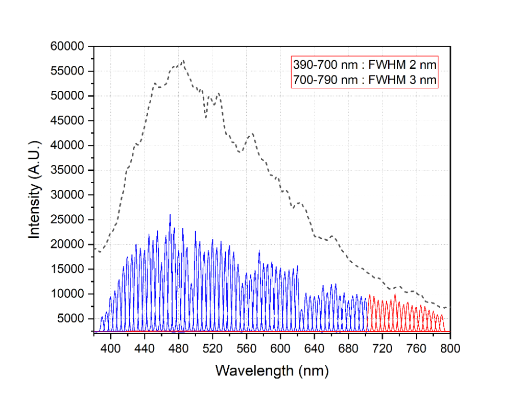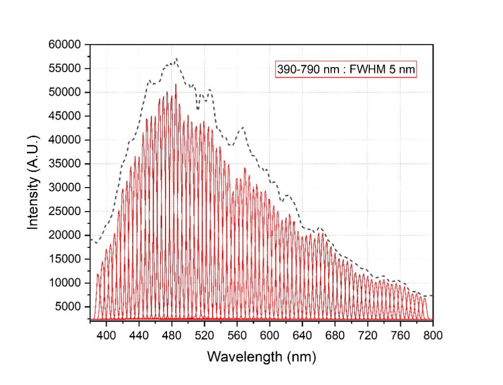 (1)下图为390-790nm范围内,FWHM设置为最小值的单色波光谱曲线,背景为原始光源光谱曲线。由于带宽较小,传输效率相对较低,但能够提供更高的分辨率,适用于对波长精度要求较高的测试。