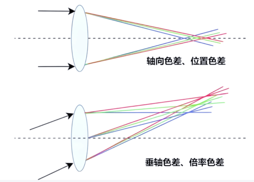 第二点是色差:不同颜色(波长)的光在玻璃中的折射率不同,导致无法汇聚于同一点。