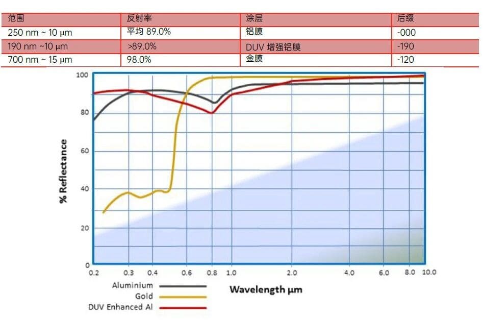 极宽光谱范围:根据波段自由选择铝膜、DUV增强铝膜或金膜,一镜覆盖所需
