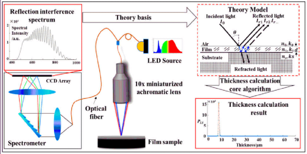 白光测厚仪的核心通常是白光干涉法或光谱反射法,其关键在于精确探测从样品不同表面(如顶部和底部)反射回的光程差。