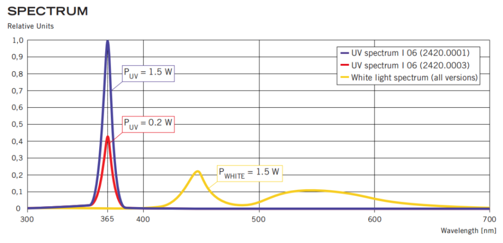 I06光源则具有更高的功率和更长的使用寿命,为荧光或液体渗透检测的紧凑型和合规LED光源,适合大规模自动化生产。光源内部配置两个LED模块,用于紫外光和白光,独立控制输出和功率大小,符合ASTM E3022-15,RRES 90061,MTV 1030-1等工业标准。