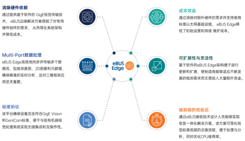 GigE Vision与GenICam是广泛采用的机器视觉标准,确保不同相机厂商、图像处理平台及自动化系统间的互操作性。通过遵循这些标准,eBUS Edge:
