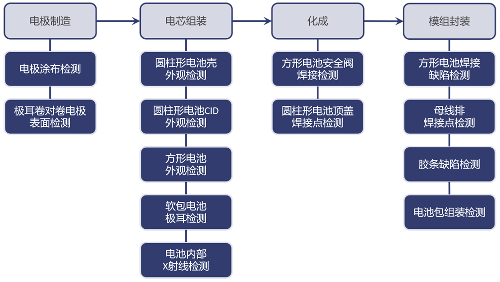 由于电池生产工序繁多且复杂,如果在生产过程中不能对缺陷进行有效检测,必然会导致一系列问题。因此,在每个工序前对零部件进行质量检查、在工序中对半成品进行检查以及在工序完成后对成品进行检查是非常必要的。